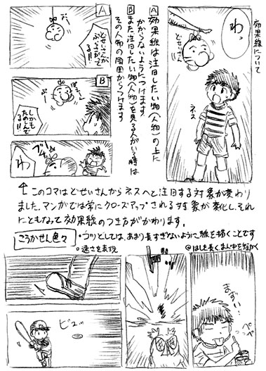 私も自己流で効果線をつけていますが、確かに漫画の書き方本などを見ると、効果の種類、ペンでの引き方等、描く方法のノウハウが多い気がします。どういうときにどの効果を使うか、というのも多いですね。