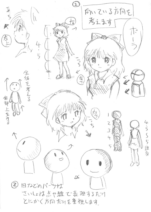 体の位置が決まったら、方向を持った絵を描きます。キャラクターがどちらを向いているか。